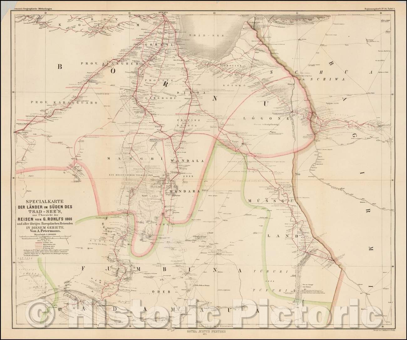 Historic Map - Specialkarte Der Lander im Suden Des Tsad-See's, zur Ubersicht der Reisehn/Map of central Africa, south of Lake Chad, Gerhard Rohlf, 1872 - Vintage Wall Art