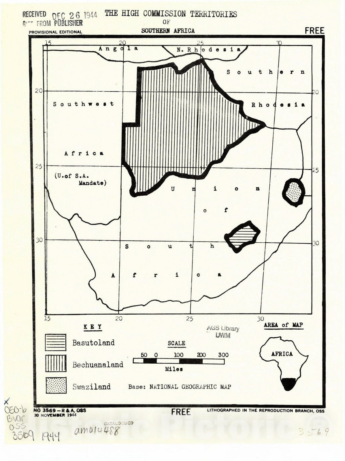 Map : Southern Africa 1944, The High Commission territories of Southern Africa, Antique Vintage Reproduction