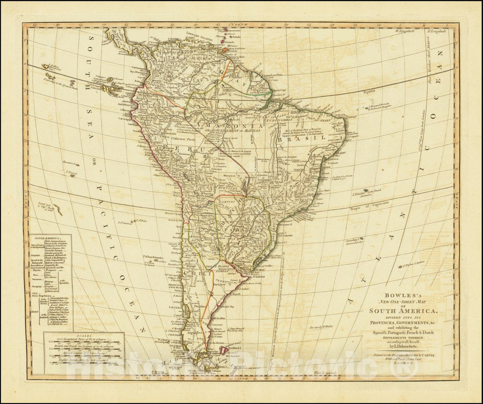 Historic Map : Bowles's New One-Sheet South America, Divided Into Its Provinces, Governments, &c. an exhibiting the Spanish, Portugese, French & Dutch Settlements Therein, 1795, Vintage Wall Art