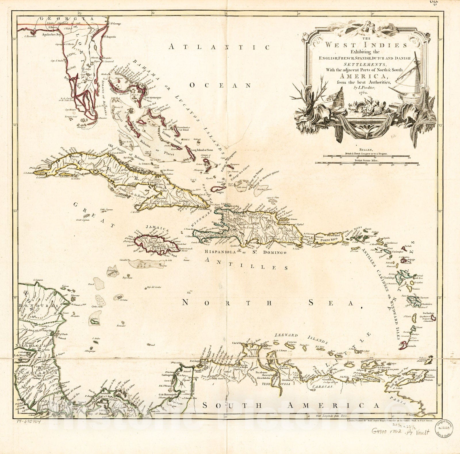 Historic 1762 Map - The West Indies exhibiting The English, French, Spanish, Dutch, and Danish settlements, with The Adjacent Parts of North & South America, from The Best Authorities,