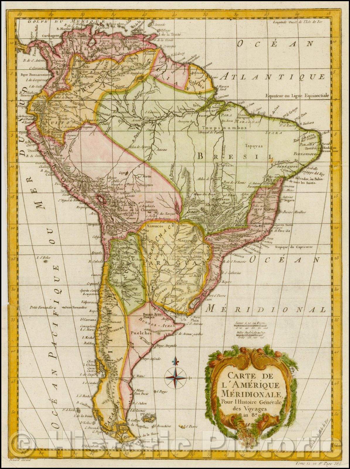 • .Historic Map - Carte De L'Amerique Meridionale Pour l'Histoire Generale de Voyages in 8o. / Map of South America, 1754, Jacques Nicolas Bellin - Vintage Wall Art