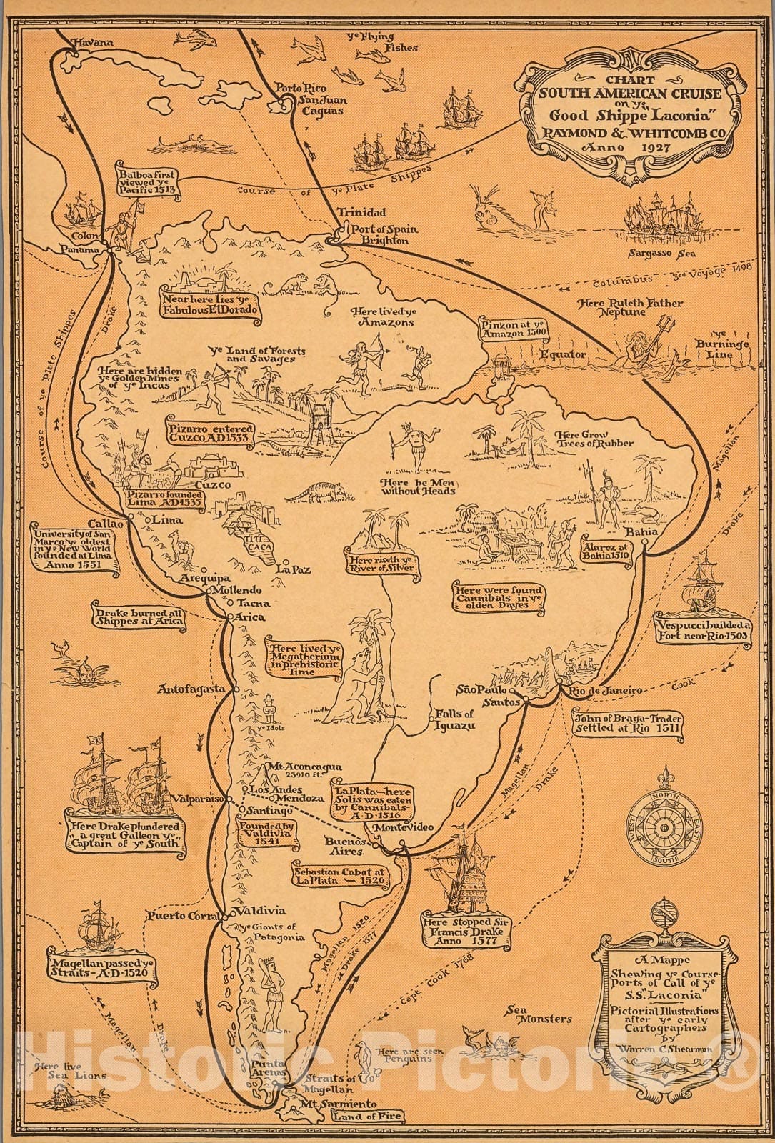 Historic Map : Chart South American Cruise on ye Good Shippe "Laconia"., 1927, Vintage Wall Decor