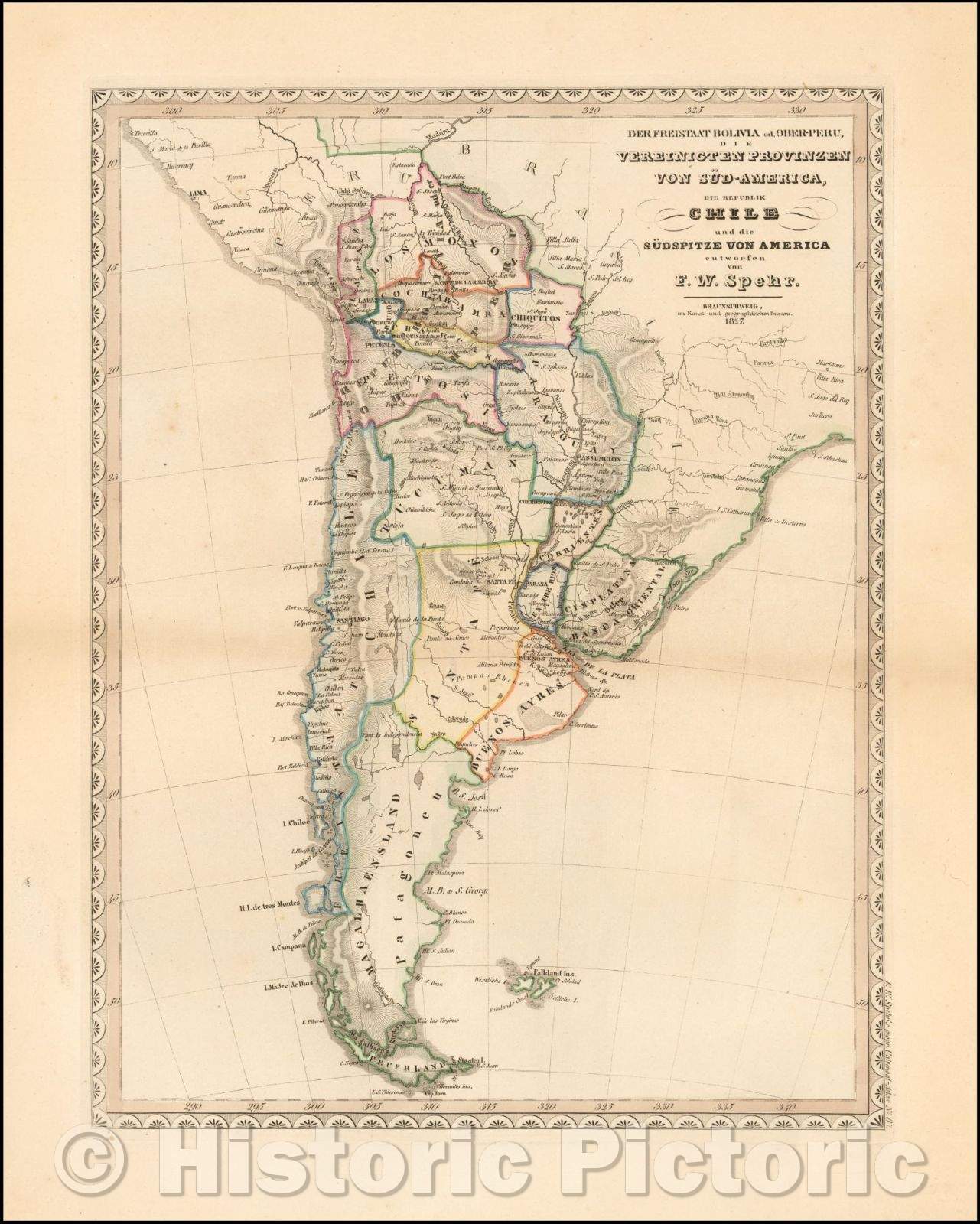 Historic Map - Der Freistaat Bolivia od Ober-Peru, die Vereingigten Provinzen von Sud-Amerika/Map of the Southern part of South America, 1827 - Vintage Wall Art