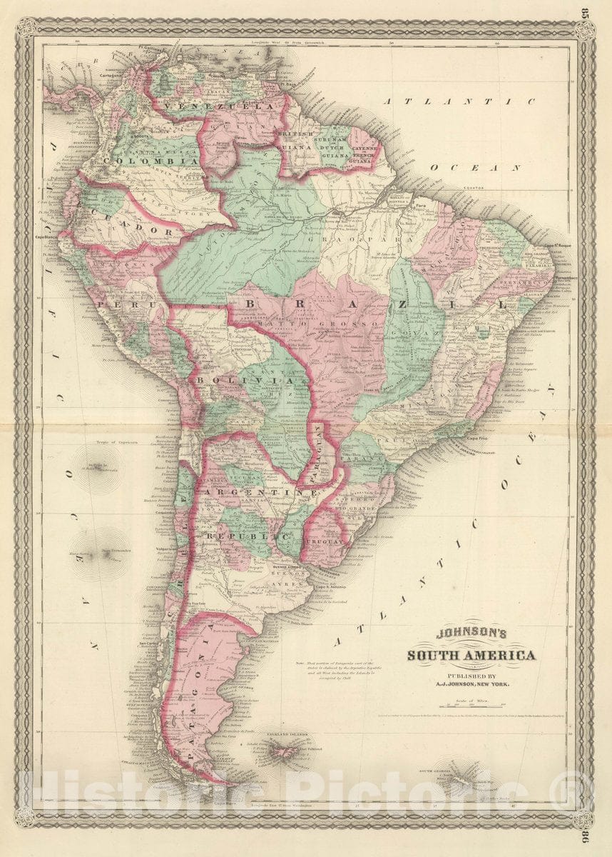 Historic Map : Johnson's South America. Published by A. J. Johnson, New York. 85. 86, 1874 Atlas - Vintage Wall Art