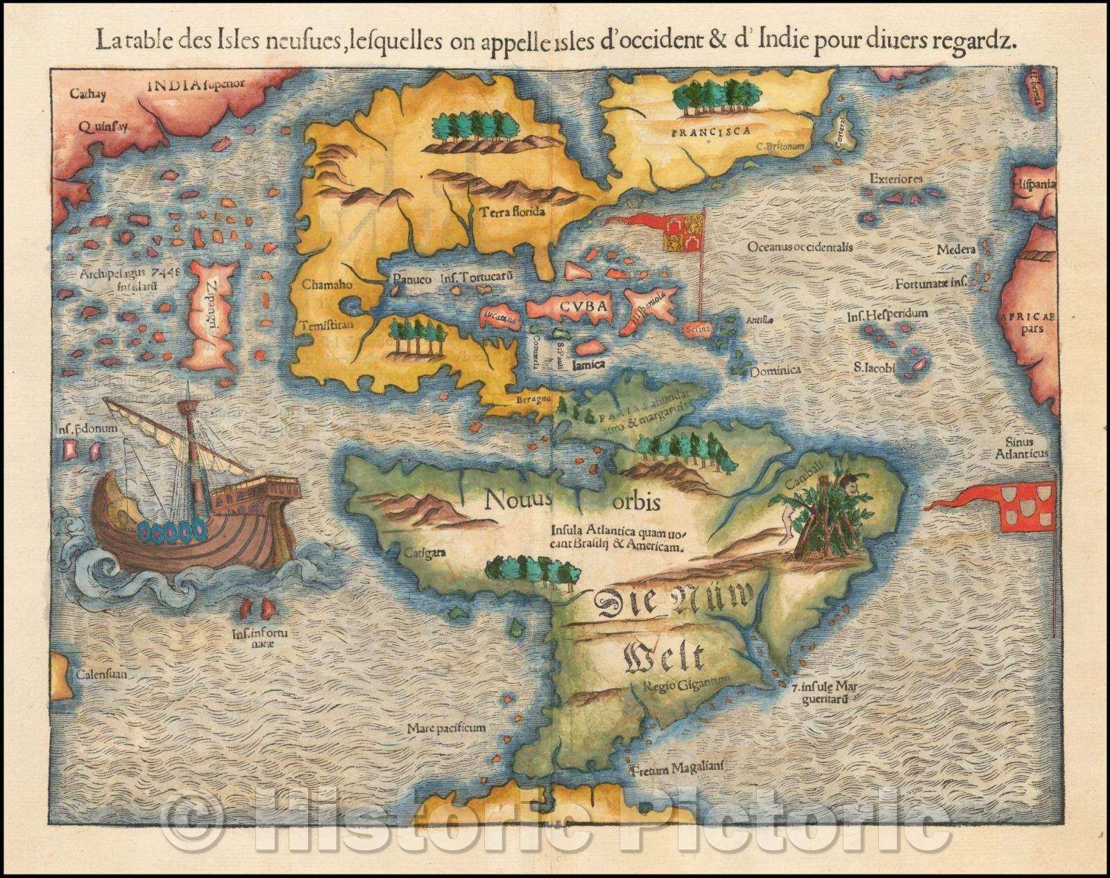Historic Map - La Table des Isles neusues, lesquelles on appelle isles d'occident / 1552 edition of Munster's Map of America, North and South America, 1552 v2