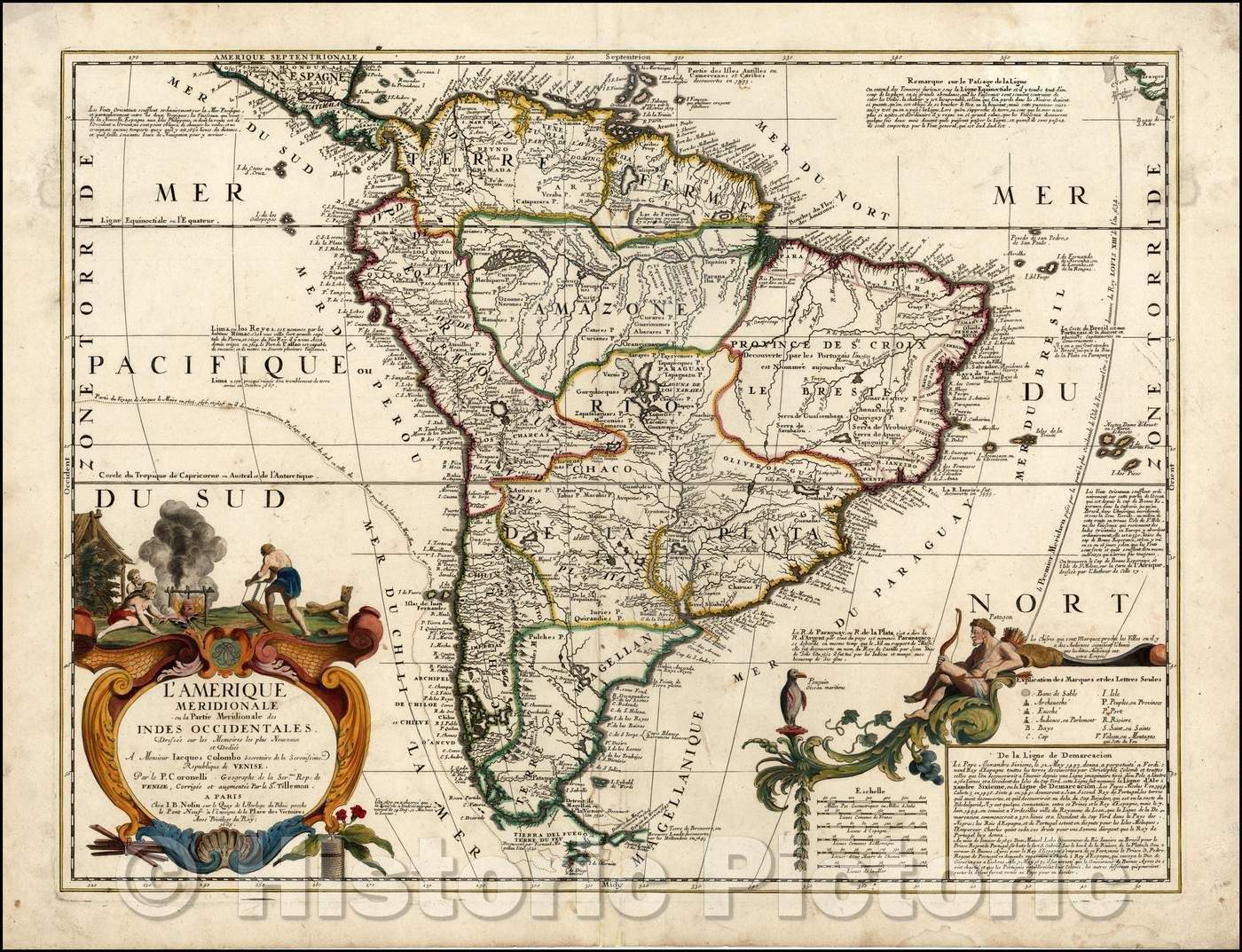 Historic Map - L'Amerique Meridionale ou la Partie Meridionale de Indes Occidentales Dressee sur les Memoires :: Color example of Nolin's of South America, 1689 - Vintage Wall Art