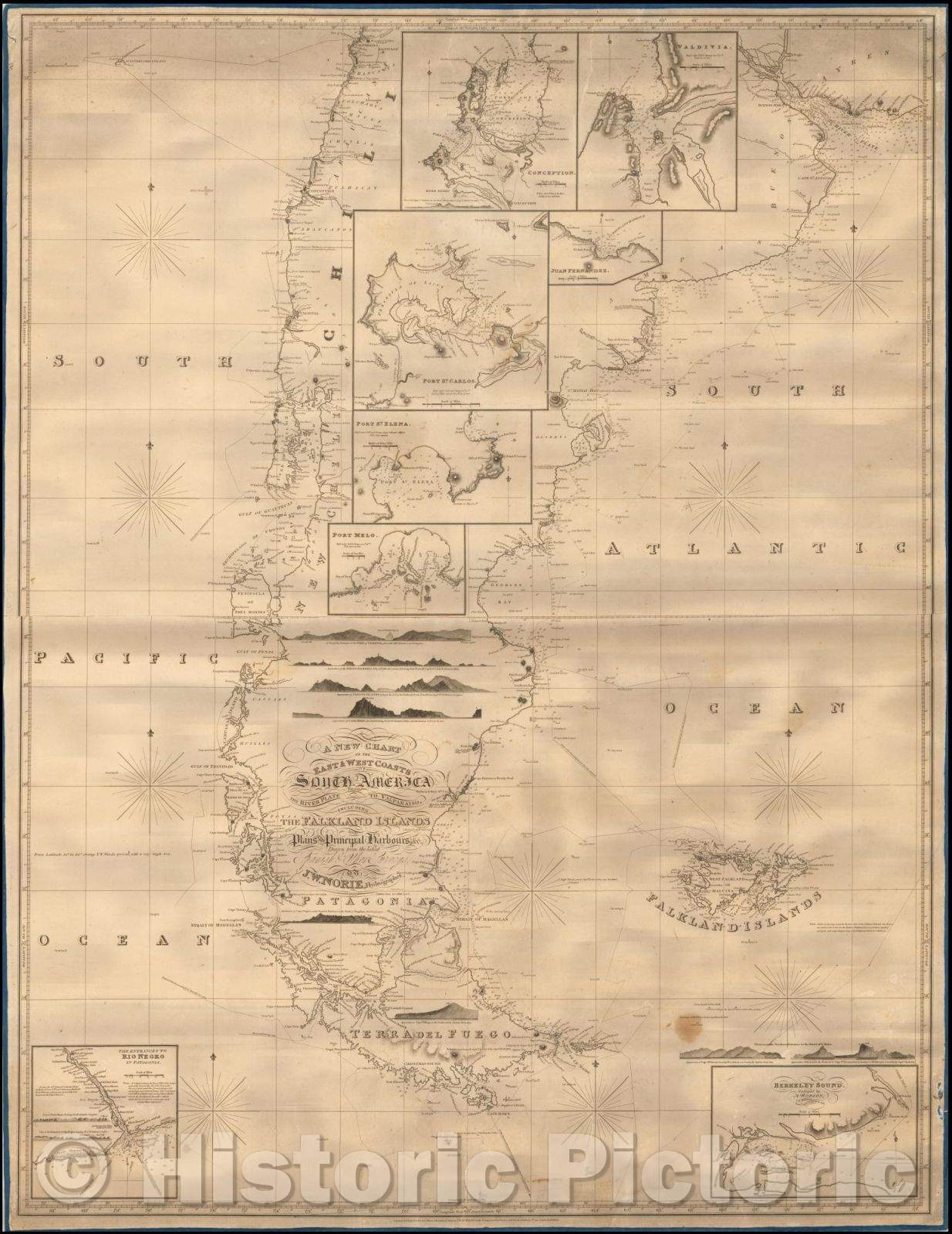 Historic Map - A New Chart of the East & West Coasts of South America from the River Plate to Valparaiso including the Falkland Islands, 1822 - Vintage Wall Art