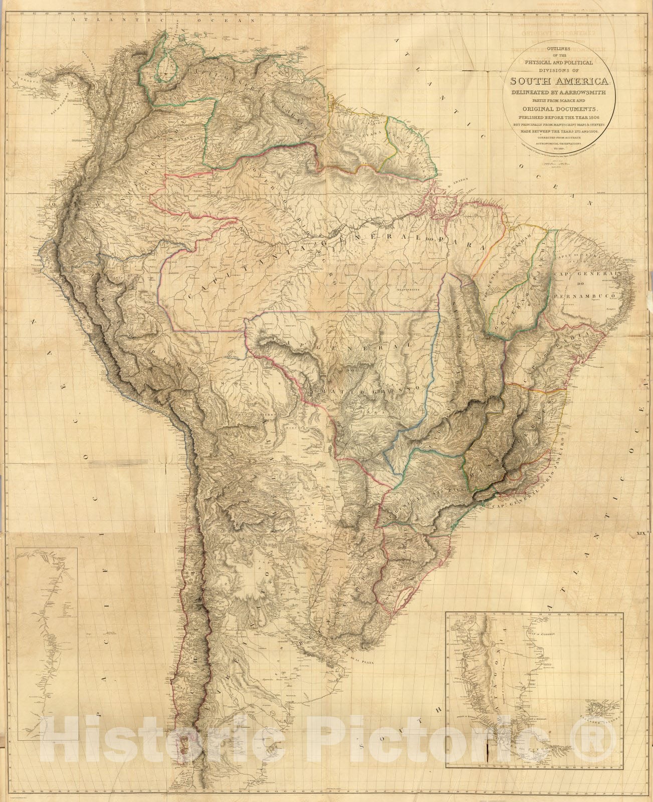 (Composite of) Outlines of the physical and political divisions of South America: delineated by A. Arrowsmith, partly from scarce and original documents, published before the year 1806 but principally from manuscript maps & surveys made between the years 1771 and 1806, corrected from accurate astronomical observations to 1810. (with Inset map of the Orinoco and Meta rivers). London, Published 4th January 1811 by A. Arrowsmith, No. 10 Soho Square, Hydrographer to H.R. H. the Prince of Wales. Additions to 1814, 1817. Engraved by Edwd. Jones. | Atlas to Thompson's Alcedo; or dictionary of America & West Indies; collated with all the most recent authorities, and composed chiefly from scarce and original documents, for that work, by A. Arrowsmith, Hydrographer to His Royal Highness the Prince Regent. London: Printed by George Smeeton, Great Saint Martin's Lane, Charing Cross. 1819. | See note field above.