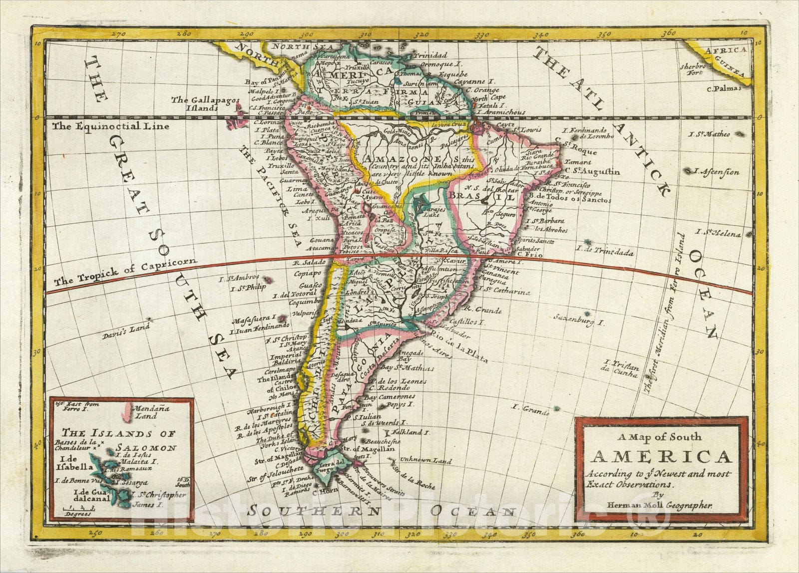 Historic Map : A Map of South America According to ye Newest and most Exact Observations, 1732, Herman Moll, Vintage Wall Art