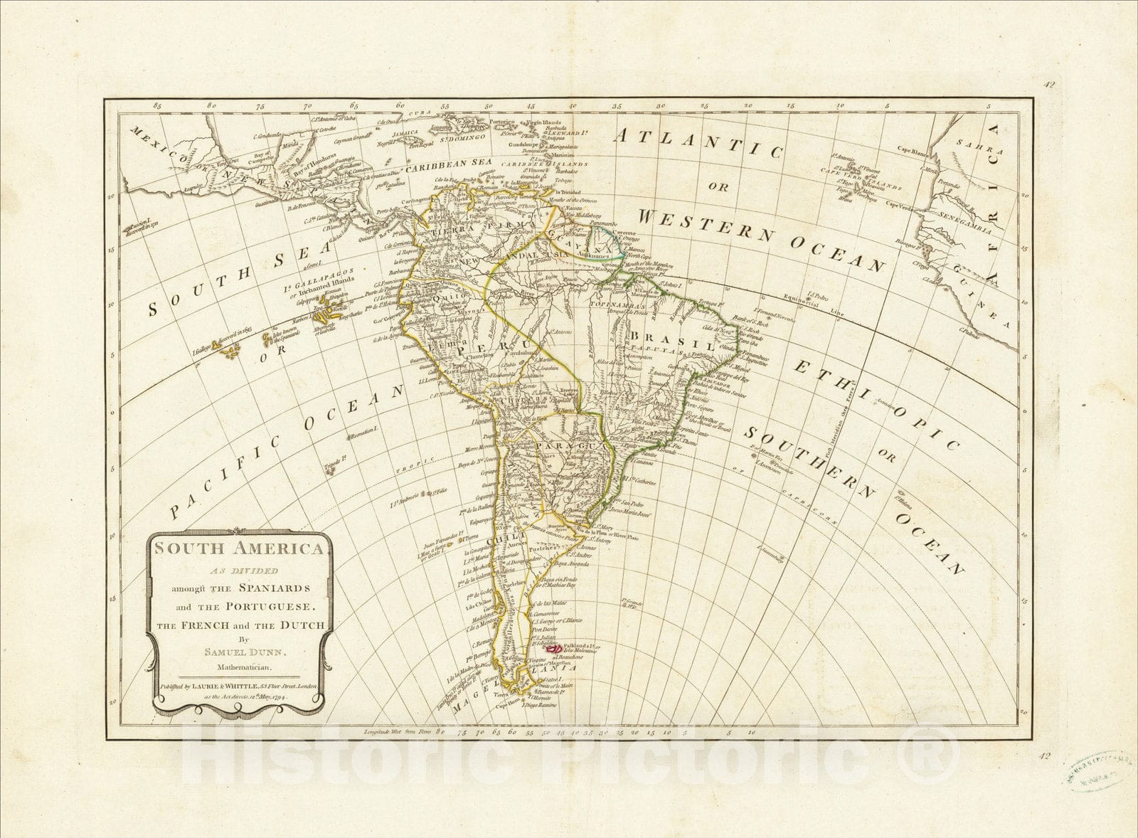 Historic Map : South America as Divided amongst The Spaniards and The Portuguese, The French and The Dutch, 1794, Samuel Dunn, Vintage Wall Art