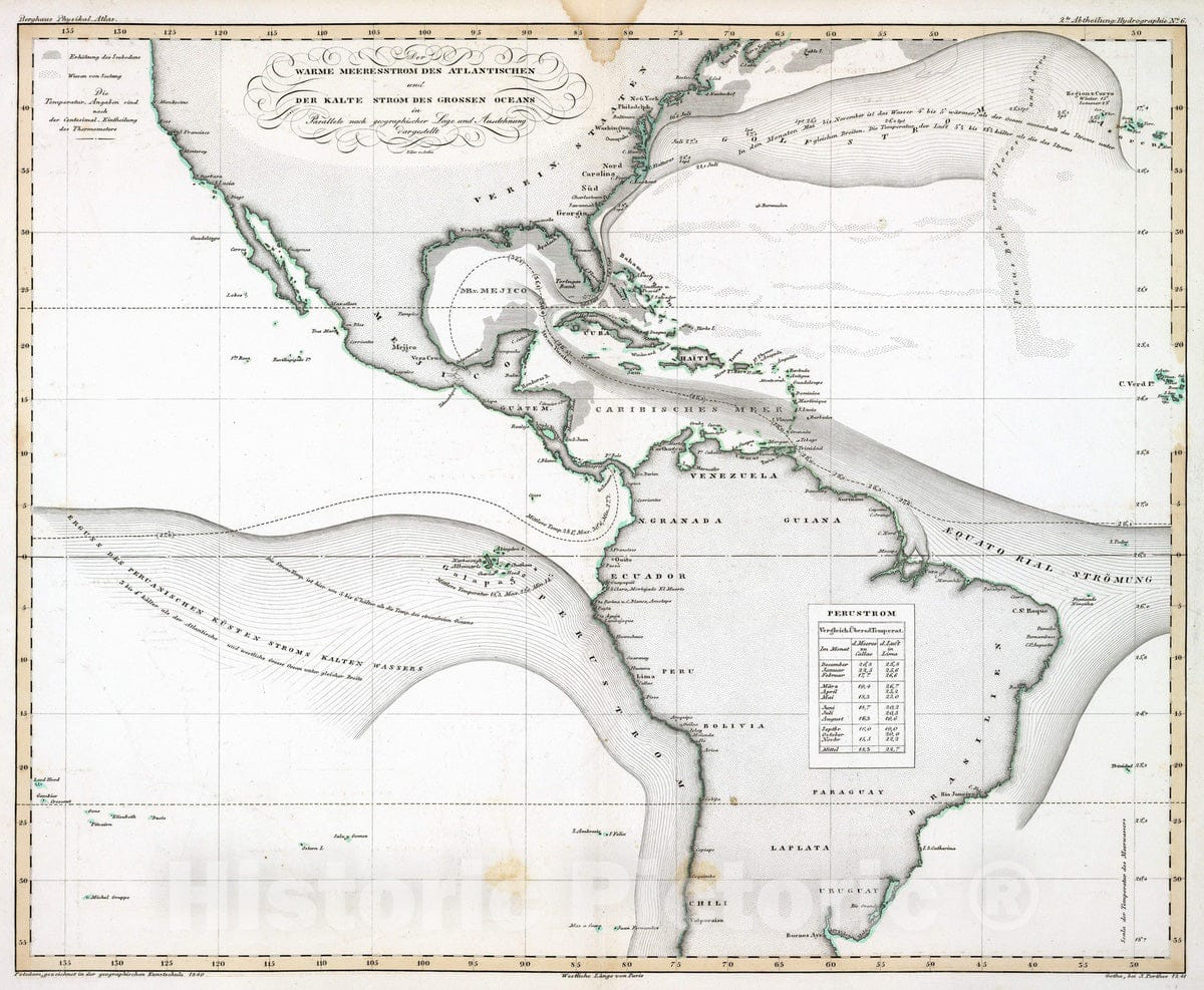 Historic Map : South America, Atlantic; Pacific 1840 Der Warme Meeresstrom Des Atlantischen. , Vintage Wall Art