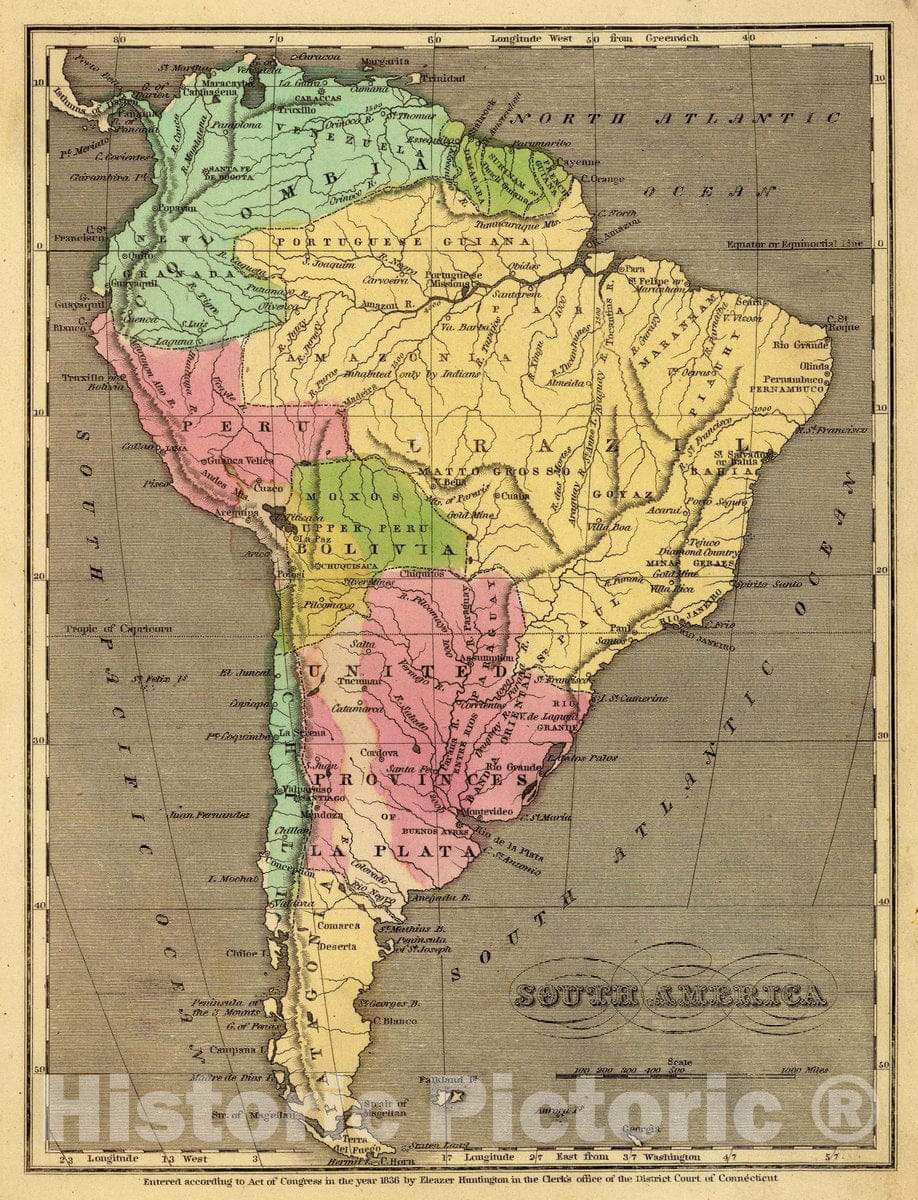 Historic Map : South America. Entered 1836, by Eleazer Huntington Connecticut, 1836 Atlas - Vintage Wall Art