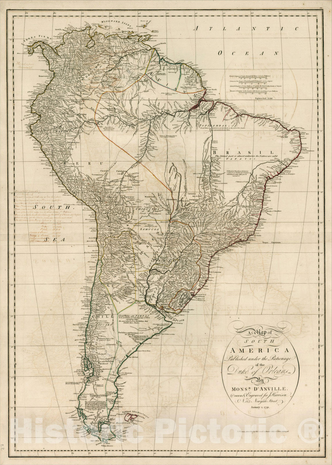 Historic Map : A Map of South America Published under the Patronage of the Duke of Orleans by D'Anville. Drawn and Engraved for J. Harrison, 1791, 1791, , Vintage Wall Art