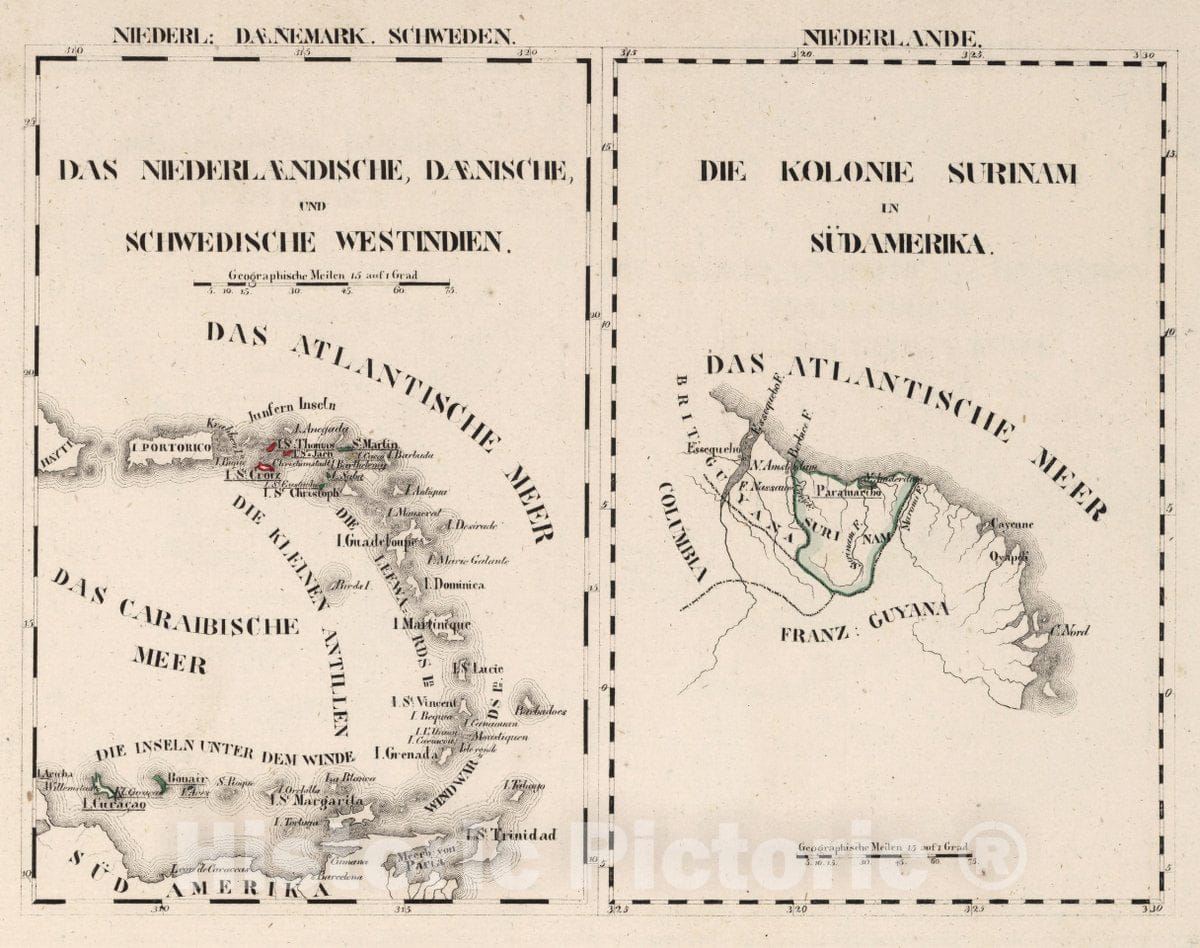 • .Historic Map : Surinam, West Indies, South America V.1-5:1. Niederlande: Daenemark, Schweden, 1825 Atlas , Vintage Wall Art
