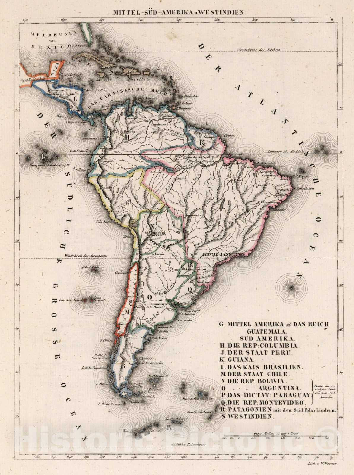 Mittel-Sud-Amerika u. Westindien. Lith. v. W. Werner. (to accompany) Atlas von Amerika in 30 Charten und einem erlauterndem Texte. | Atlas von Amerika in 30 Charten und einem erlauterndem Texte. Entworfen von W. E. A. von Schlieben ; die Charten lithographirt, Werner. Leipzig, bei George Joachim Goschen, 1830. | Atlas of America, with 54 pages of text, index, abbreviations,and outline hand color maps, some folded. Includes Index. Bound in beige cardboard covers with decorative border, 35x26.5, title " W. E. A. von Schlieben, Atlas von Amerika. Leipzig, bei George Joachim Goschen".