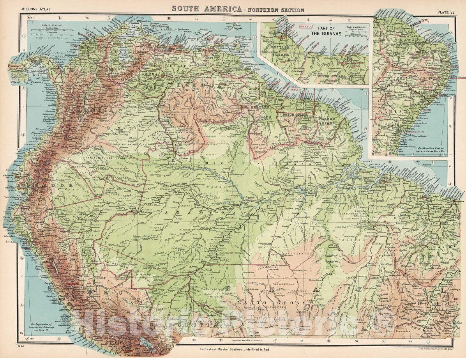 Plate 22. South America - Northern Section. (inset) Part of the Guianas. | World Missionary Atlas. Containing a Directory of Missionary Societies, Classified Summaries of Statistics, Maps Showing the Locations of Missionary Stations throughout the World, a Descriptive Account of the Principal Mission Lands, and Comprehensive Indicies. Edited by Harland P. Beach, D.D, F.R.G.S., Charles H. Fahs, B.A., B.D. Maps by John Bartholomew, F.R.G.S. of the Edinburgh Geographical Institute. New York, Institute of Social and Religious Research, 1925. | Maps in full color. Relief is shown by hypsometric tints.