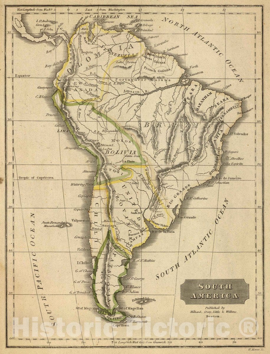 Historic Wall Map : South America. Published by Hilliard, Gray, Little & Wilkins, Boston. H. Morse Sc. (1829), 1829 Atlas -