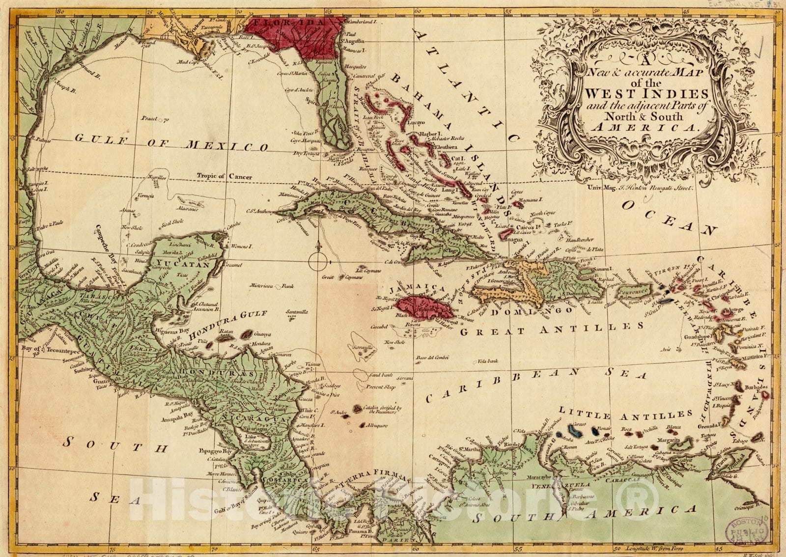 Historical Map, 1755 A New & Accurate map of The West Indies and The Adjacent Parts of North & South America, Vintage Wall Art