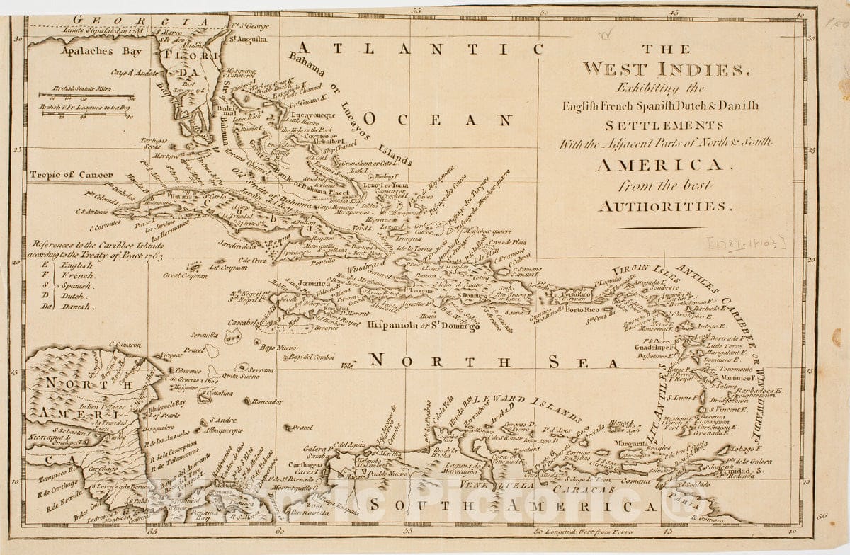 Historical Map, c.1780 The West Indies, exhibiting The English French Spanish Dutch & Danish settlements with The Adjacent Parts of North & South America, Vintage Wall Art