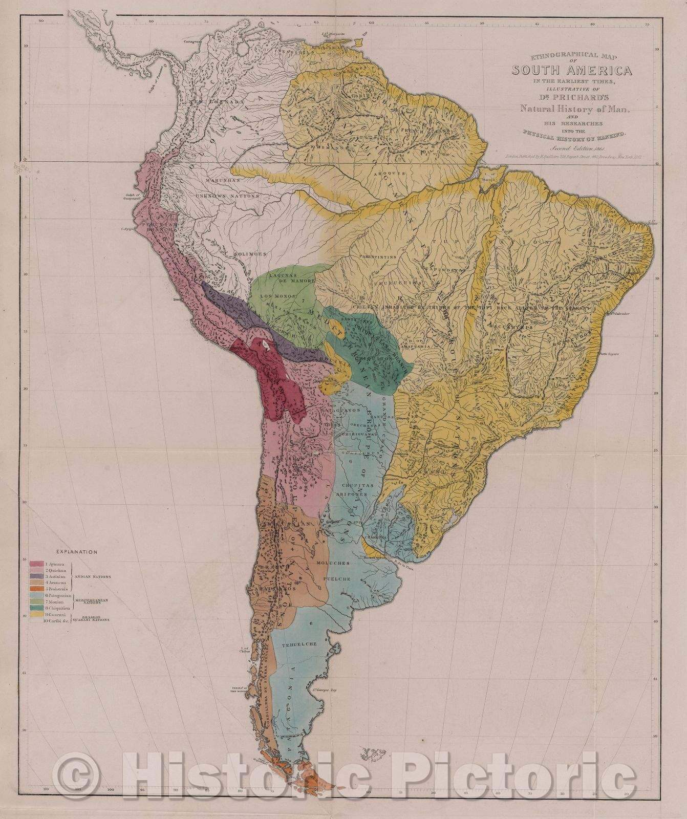 Historic Map : Ethnographical Map of South America in the earliest times, illustrative of Dr. Prichard's Natural History of Man, 1864 , Vintage Wall Art
