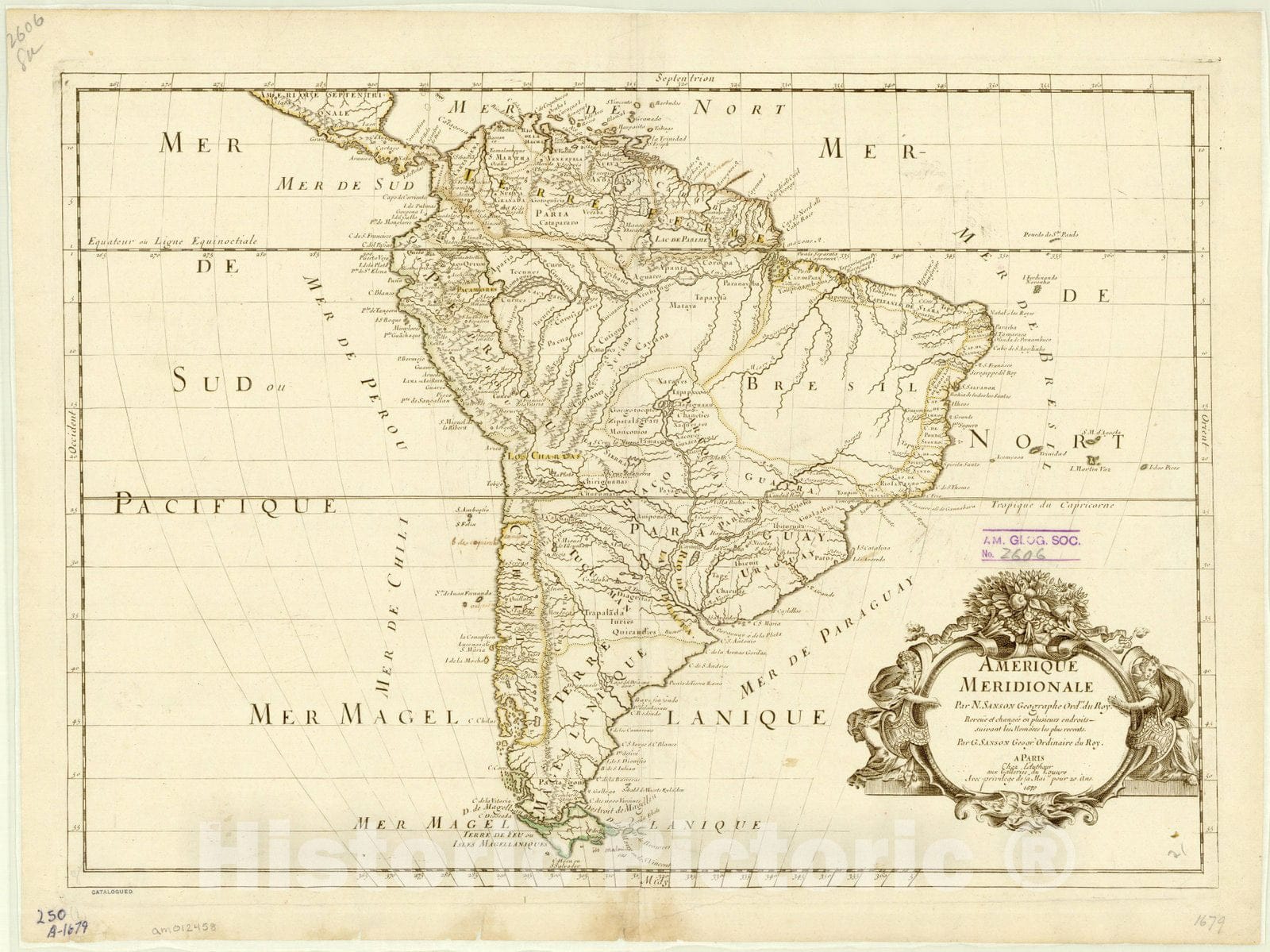 Map : South America 1679, Amerique Meridionale par N. Sanson geographe ordre. du roy : Reveue et changee en plusieurs endroits suivant les memoires les plus recents