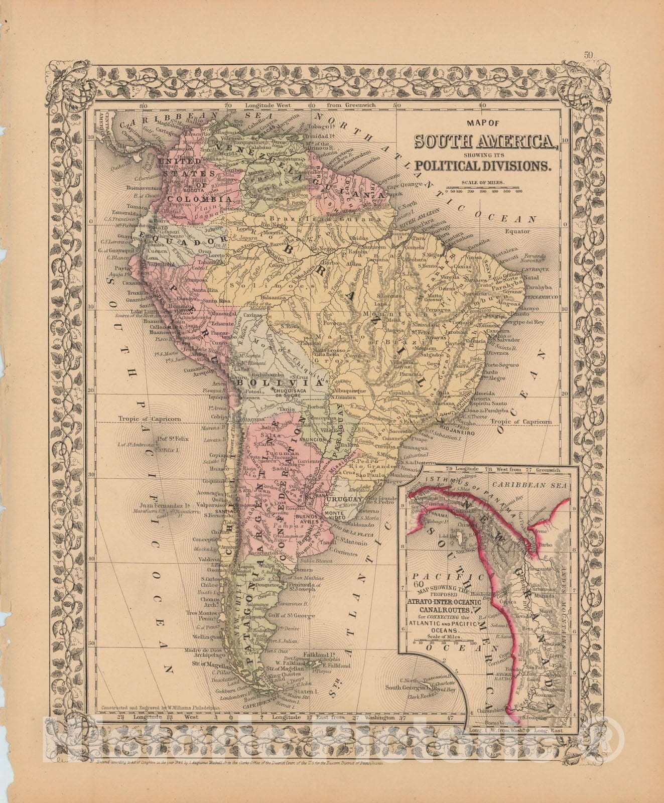 • .Historic Map : South America 1867 , New General Atlas , Vintage Wall Art