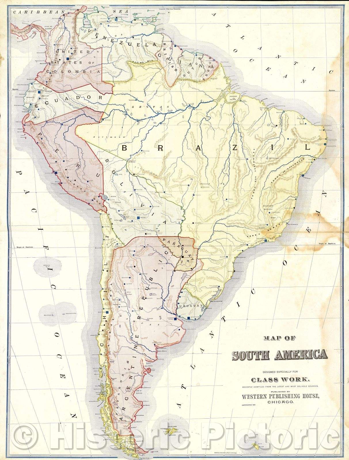 Historic Map : Yaggy's Geographical Study: "Map of South America Designed Especially for Class Work", 1887 , Vintage Wall Art