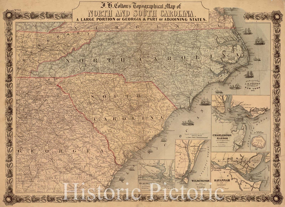 Historical Map, 1861 J.H. Colton's Topographical map of North and South Carolina : a Large Portion of Georgia & Part of adjoining States, Vintage Wall Art