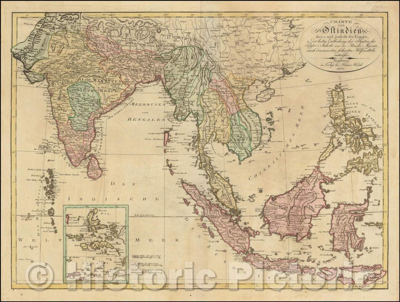 Historic Map - Charte von Ostindien dies- und jenseits des Ganges, u. der lezten Zerth/Map of India, Southeast Asia and Philippines, Johann Walch, 1805 - Vintage Wall Art