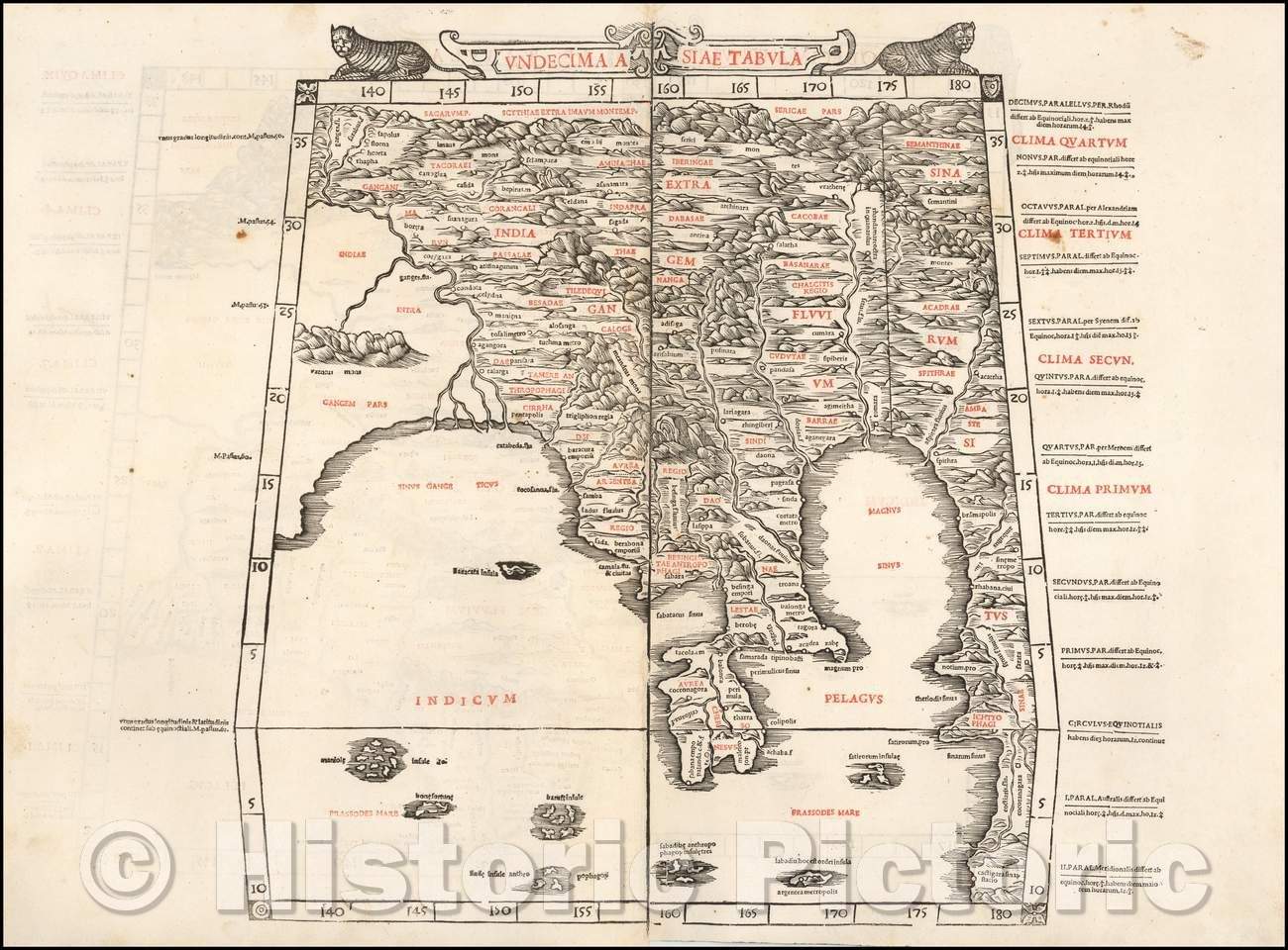 Historic Map - Undecima Asiae Tabula [India, Southeast Asia] / Sylvanus' Map of Southeast Asia, China, India, and adjoining Regions, 1511, Bernardus Sylvanus - Vintage Wall Art