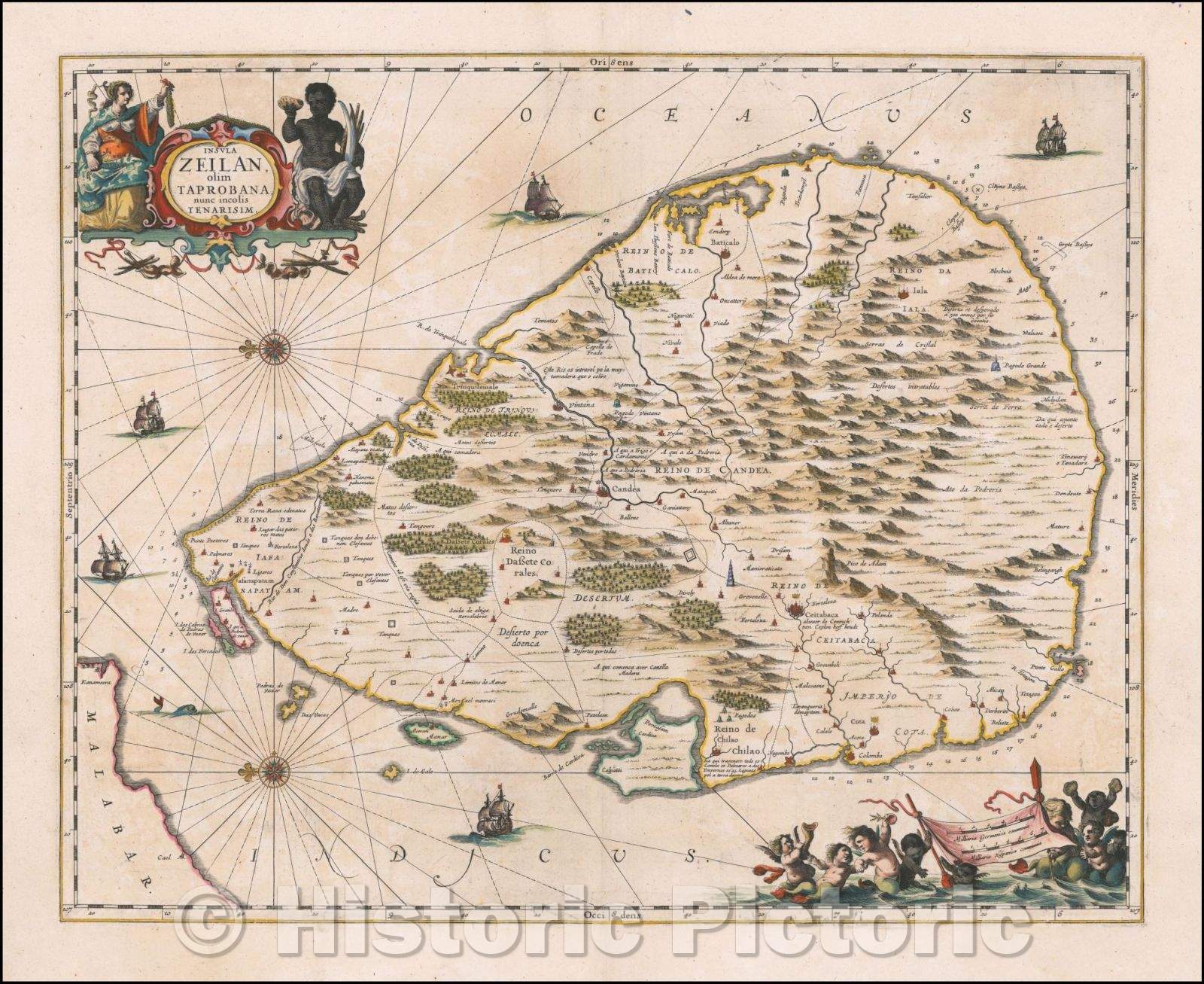 Historic Map - [Sri Lanka] Insula Zeilan olim Taprobana nunc incolis Tenarisim/Map of Sri Lanka, title cartouche, 1650, Jan Jansson - Vintage Wall Art