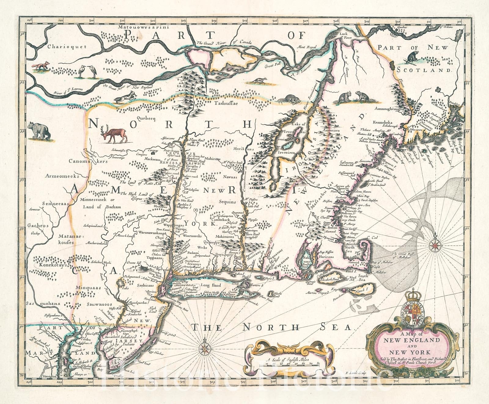Historic 1676 Map - A Map Of New England And New York - New England - New Jersey - New York (State) Maps Of North America. - Vintage Wall Art