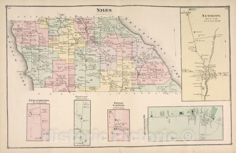 • .Historic Map - Niles [Township]; Newhope [Village]; Nine Corners [Village]; Pen - Atlases Of The United States - County Atlas Of Cayuga, New York. - Vintage Wall Art