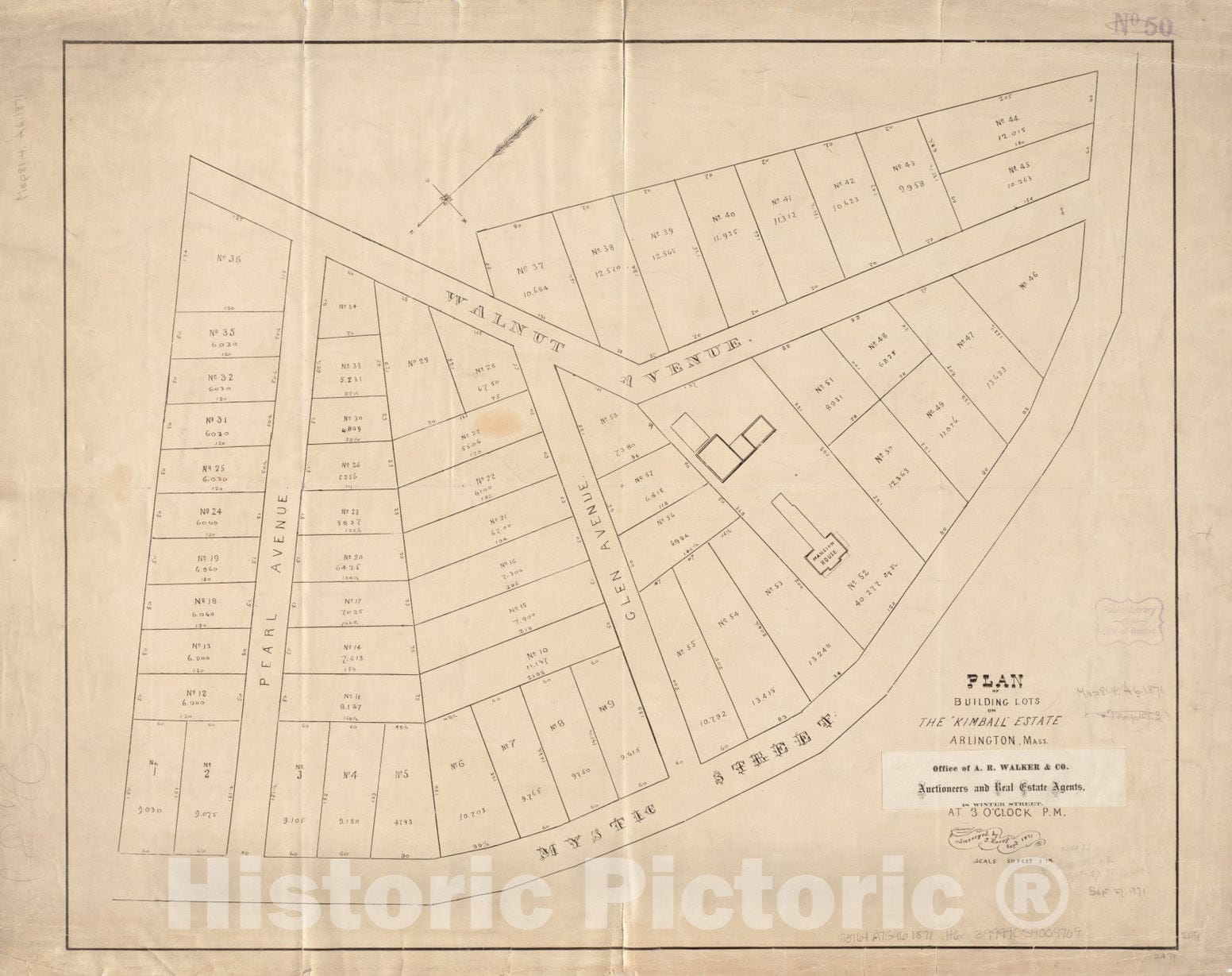 • .Historical Map, 1871 Plan of Building Lots on The 'Kimball' Estate Arlington, Mass. at 3 o'clock p.m, Vintage Wall Art
