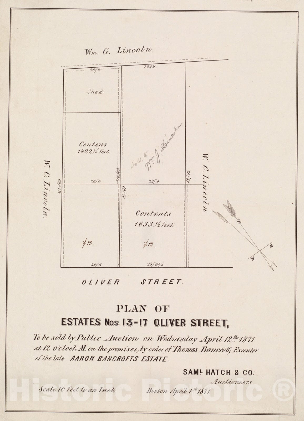 • .Historical Map, Plan of estates nos. 13-17 Oliver Street, to be sold by public auction on Wednesday April 12th 1871 at 12 o'clock m. on the premesis, by order of Thom, Vintage Wall Art