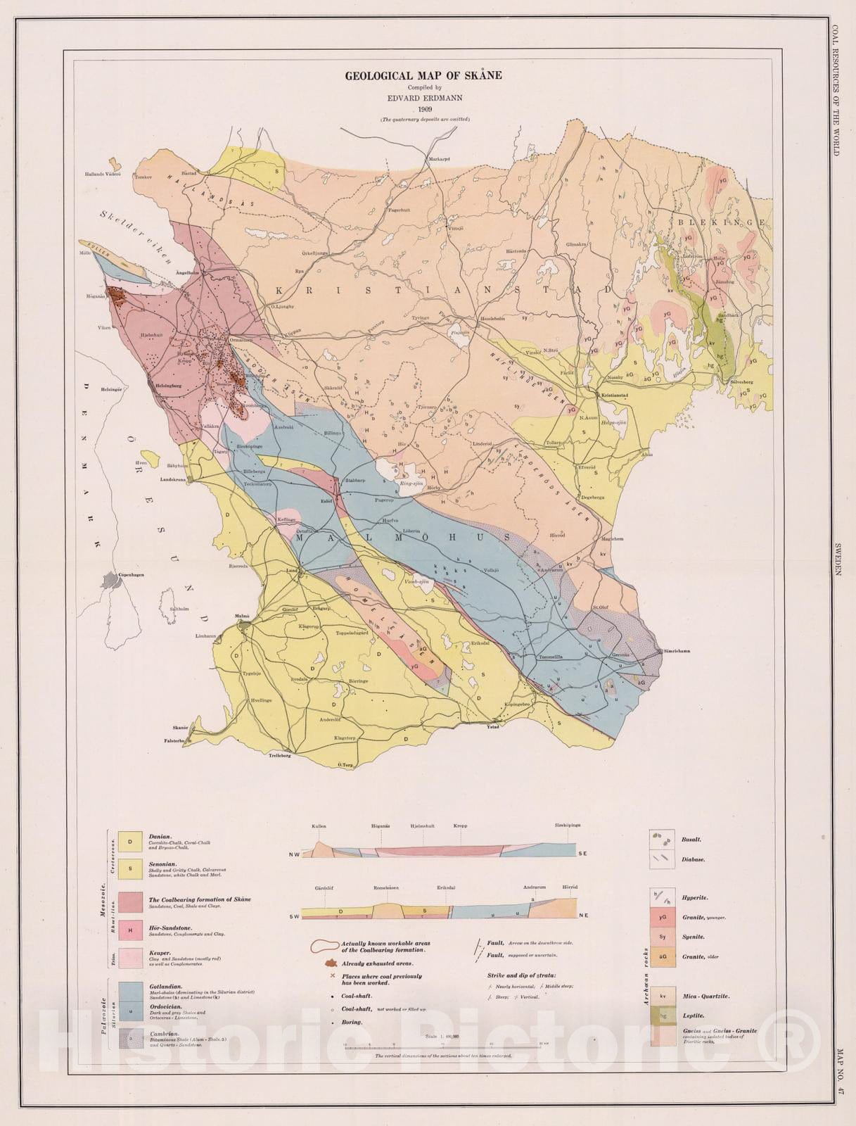 • .Historic Map : Geologic Atlas - 1909 Skane, Sweden. Coal Resources of the World. - Vintage Wall Art