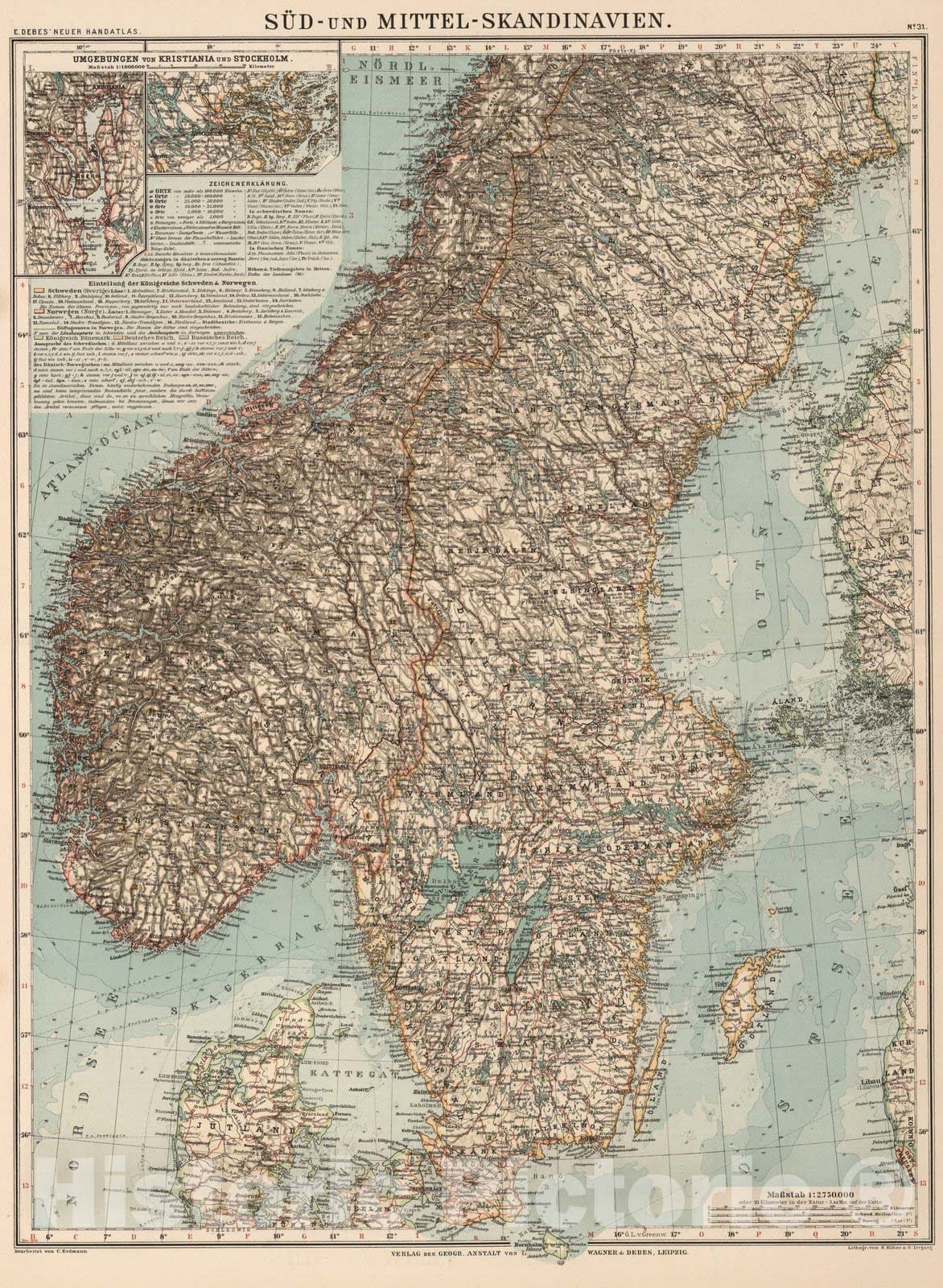 Sud - und Mittel - Skandinavien. Bearbeitet von C. Erdmann. Lithogr. von K. Kuhne & O. Irrgang. Verlag der Georg. Anstalt von Wagner & Debes, Leipzig. (to accompany) Neuer Handatlas uber alle Teile der Erde.1899. 31. (insets) Umgebung von Kristiania und Stockholm. | Neuer Handatlas uber alle Teile der Erde. In 61 Haupt- und 124 Nebenkarten mit alphabetischen Namenverzeichnis. Herausgegeben von E. Debes. Zweite vermehrte un verbesserte Auflage. Leipzig, H. Wagner & E. Debes, 1899. | Second and revised edition of E. Debes' Neuer Hand Atlas, published in 1899, reflects the latest available data of physical and topographical geography available. It contains 61 double page maps, table of contents and an alphabetical index at the end of atlas. The principal alterations and additions to this atlas are a new physical map of Europe, showing the elevations of the land and depths of the sea, and a map of the Mediterranean sea and the surrounding countries, on which all steamer routes, railways, and telegraph lines are laid down, with three insets illustrating meteorology and botany of the Mediterranean basin. The maps which appeared in the 1st edition in 1895, have been corrected and brought up to date, and the indexes which followed each map have been superseded by a general index at the end of the atlas. Bound in half leather, dark blue hard cover, large gold embossing decoration and title " E. Debes' Neuer handatlas".