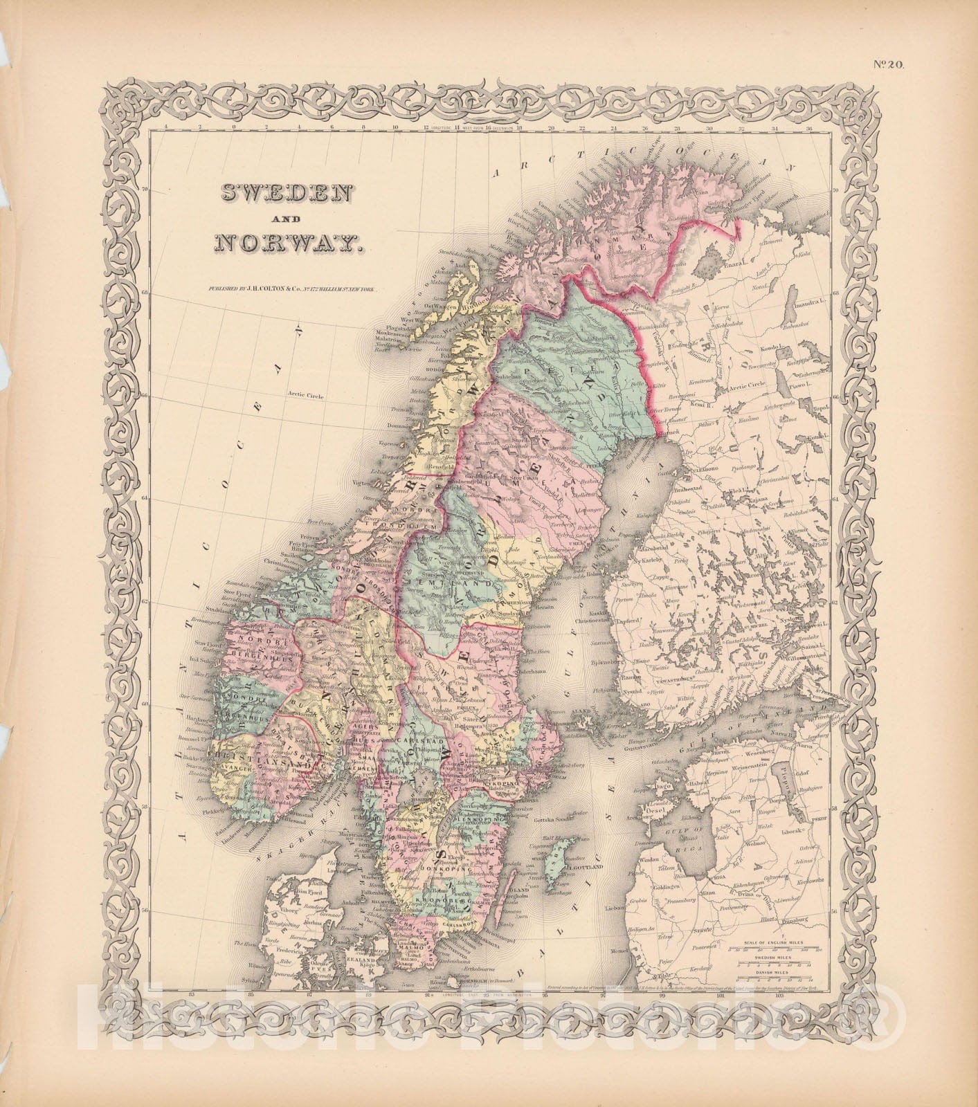 • .Historic Map : Sweden & Norway 1856 , Colton's Atlas World , Vintage Wall Art