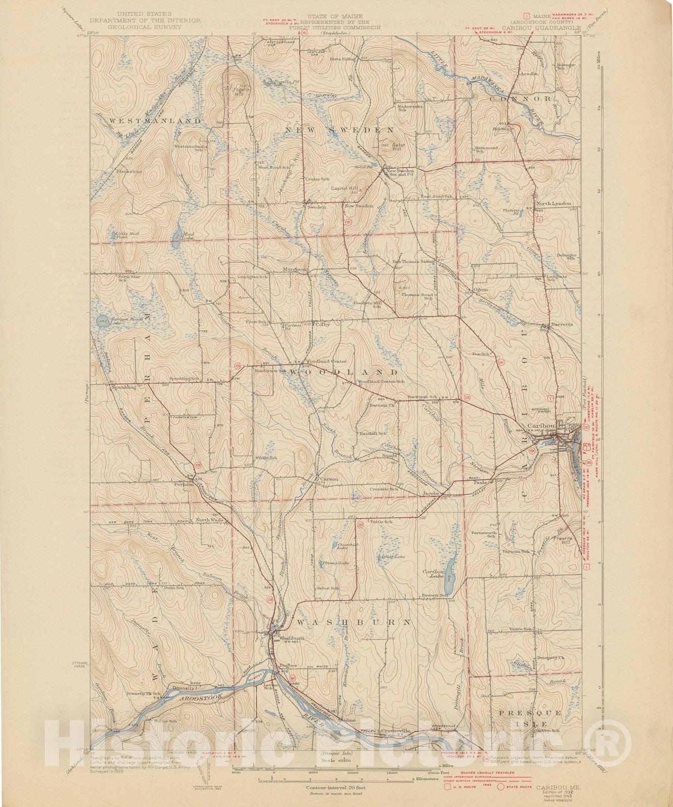 • Historic Map : USGS 7.5 Minute Sheets and Quadrangles, Caribou & New Sweden & Washburn & Woodland 1943 Topographic Map , Vintage Wall Art