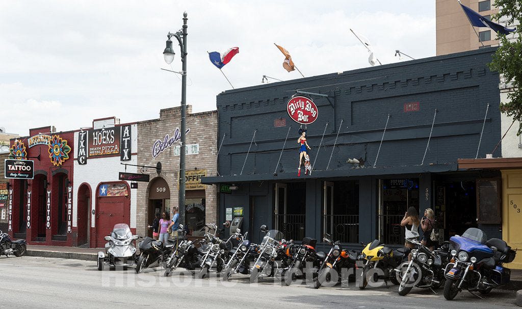 Austin, TX Photo - Motorcycles Parked Outside The Dirty Dog Bar on East Sixth Street, Locally Known as Dirty Sixth, in Austin, Texas