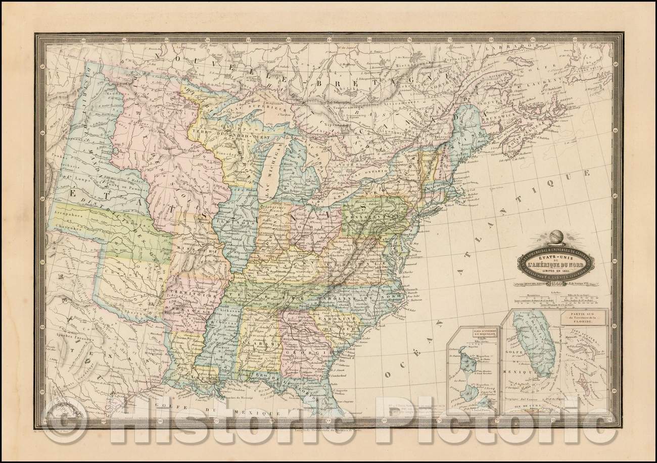 Historic Map - ?ats-Unis de L'Amerique Du Nord Limites En 1835 / Boundaries of the US immediately prior to Texas claiming its independence, 1860 - Vintage Wall Art