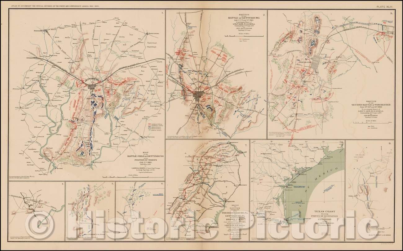 Historic Map - Battle-Field of Gettysburg with Positions of Troops July 2nd 1863 and Sketch of the 2nd Battle of Winchester, Marietta, Georgia, Dallas, Texas Coast, 1891 - Vintage Wall Art