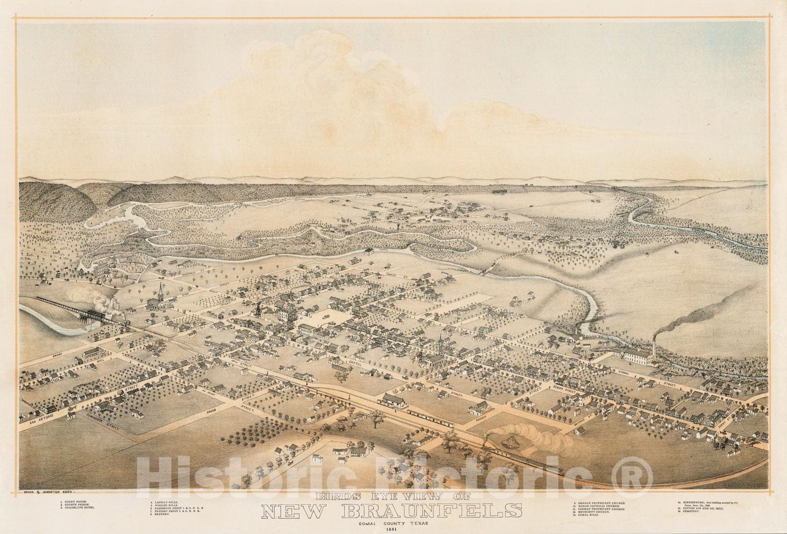 Historic Map - Bird?s Eye View of New Braunfels Comal County Texas, 1881, Augustus Koch - Vintage Wall Art