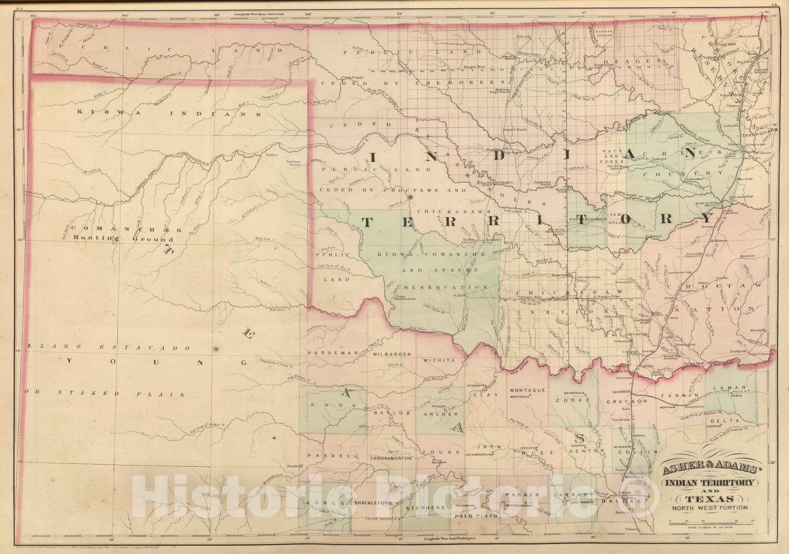 Historic Map : Commercial Reference Book - 1875 Indian Territory and Texas, North West Portion. - Vintage Wall Art