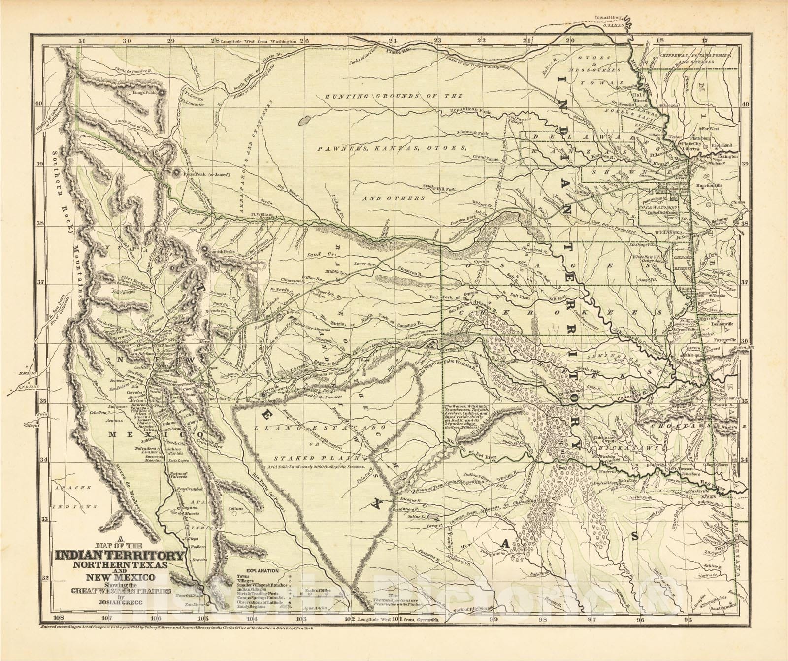 • .Historic Map : A Map of The Indian Territory, Northern Texas And New Mexico Showing the Great Western Prairies by Josiah Gregg, 1844, Josiah Gregg, v3, Vintage Wall Art