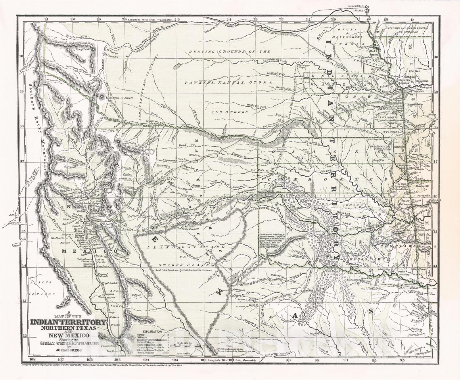 A Map of The Indian Territory, Northern Texas And New Mexico Showing the Great Western Prairies by Josiah Gregg, 1844, Josiah Gregg, v1, Vintage Wall Art :
