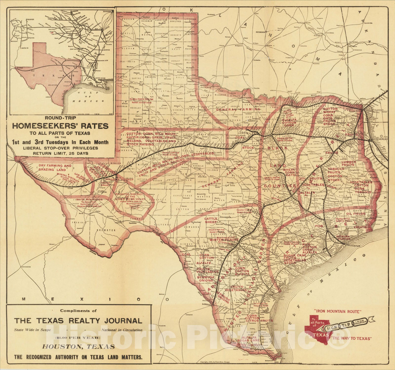 Historic Map : Iron Mountain Route to all Parts of Texas - Round-Trip Homeseekers' Rates to All parts of Texas, 1909, Poole Brothers, Vintage Wall Art