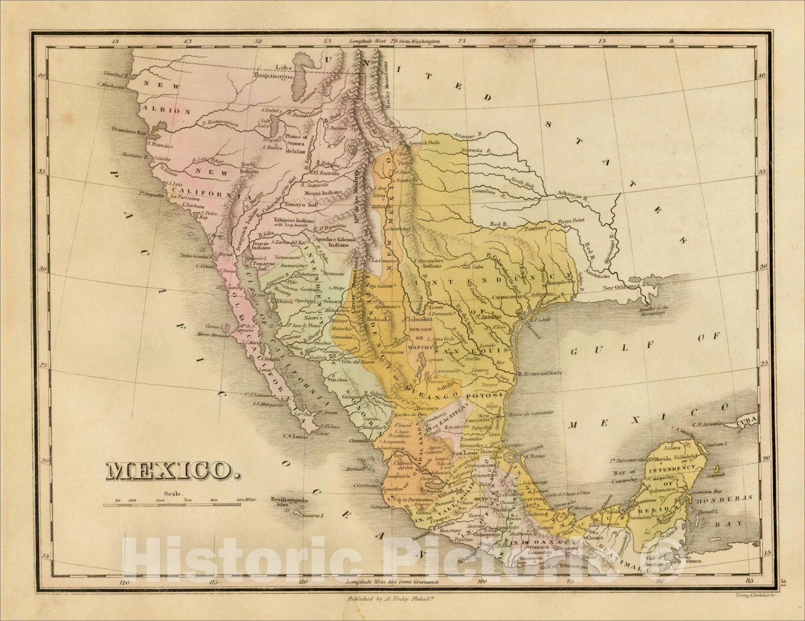 Historic Map : Mexico [including Texas & Upper California], 1824, Anthony Finley, v2, Vintage Wall Art