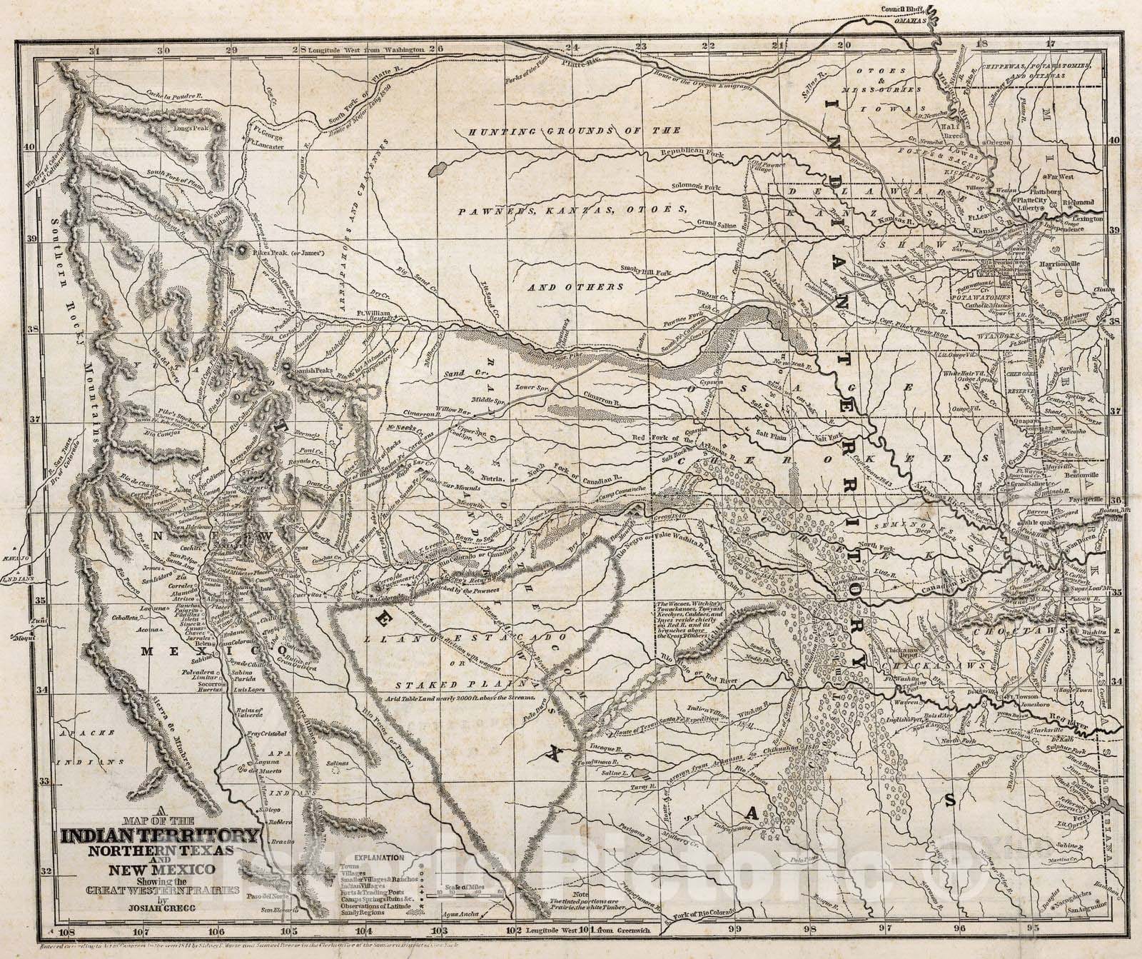 Historic Map : National Atlas - 1844 Historic Wall Map of the Indian territory : Northern Texas and New Mexico - Vintage Wall Art