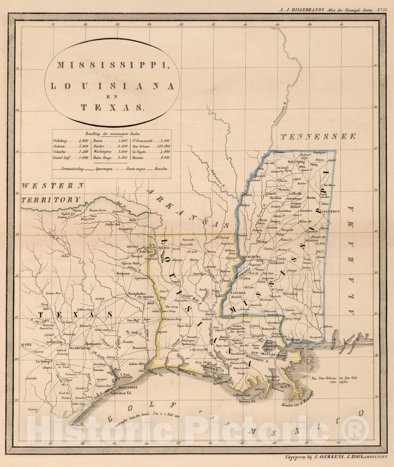 Historic Map : National Atlas - 1851 Mississippi, Louisiana, en Texas. - Vintage Wall Art